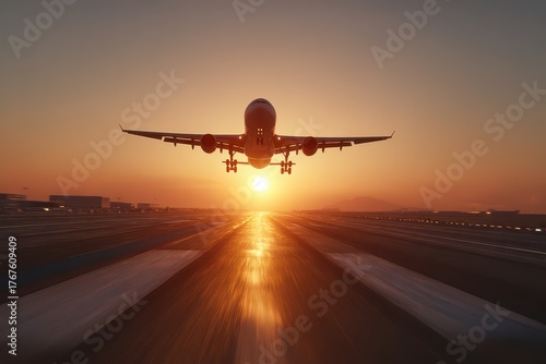 © whitestorm, Fototapeta premium Commercial passenger airplane taking off from runway at vibrant sunset.