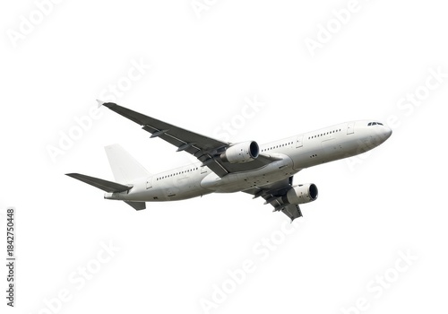 © twilight mist, Fototapeta premium Commercial passenger jet aircraft flies upward against a stark white background