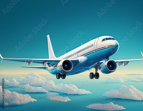 © Bonita, Fototapeta premium Commercial plane isolated on blue background, white aircraft, Twin-engine jet aircraft, Generative AI
