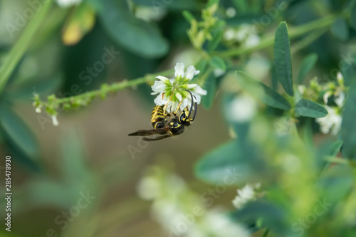© Erik, Fototapeta premium Common Aerial Yellowjacket on White Sweet Clover Flower