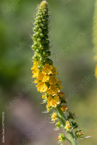 © Oleh Marchak, Naklejka premium Common agrimony blooms in a vibrant display during late spring showcasing colorful yellow flowers on a slender green stem in a natural habitat