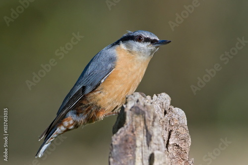 © czjonyyy, Fototapeta premium Common bird Sitta europaea aka Eurasian nuthatch perched on sunny spot. Close-up portrait. Isolated on blurred background. Early autumn.