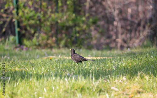 Obraz premium Common blackbird/Eurasian blackbird in green meadow at morning.