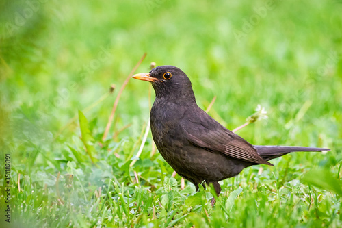 Obraz premium Common blackbird male on grass (Turdus merula)