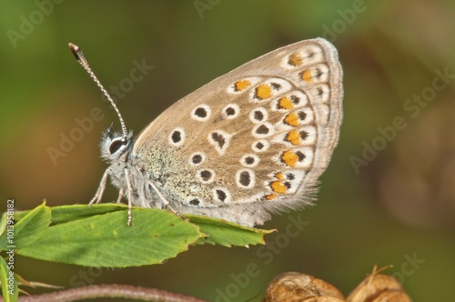 © Hans Lang/imageBROKER, Fototapeta premium Common blue (Polyommatus icarus) female sitting on leaf, Baden-Württemberg, Germany, Europe