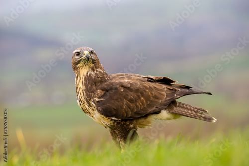 Fototapeta premium Common Buzzard (Buteo buteo) feeding on a rabbit in the mid-Wales countryside, UK