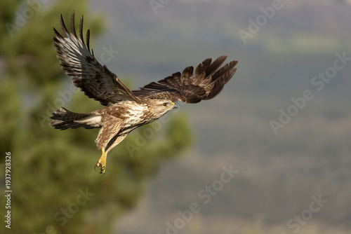 © Jesus, Fototapeta premium Common buzzard flying within its territory in a Mediterranean forest in the early light of a winter day