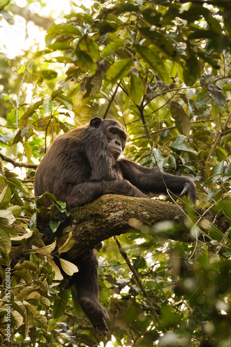 © Gunter, Fototapeta premium Common Chimpanzee ( Pan troglodytes schweinfurtii) relaxing in a tree in beautiful light, Kibale Forest National Park, Rwenzori Mountains, Uganda.