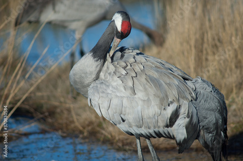 © Víctor, Fototapeta premium Common crane Grus grus preening. Gallocanta Lagoon Natural Reserve. Aragon. Spain.