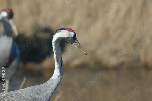© Víctor, Obraz premium Common crane Grus grus with a dragonfly in its beak. Gallocanta Lagoon Natural Reserve. Aragon. Spain.