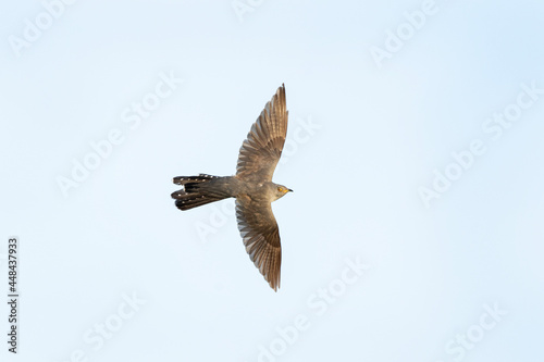 Fototapeta premium Common cuckoo flying during morning time. Ornithology in the Rhodope mountains. Bulgaria birds during spring season.