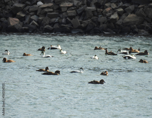 Fototapeta premium Common eider ducks swimming in the Cape Cod Canal, during the winter season,...