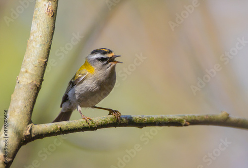 © Simonas, Fototapeta premium Common Firecrest - male bird at a wet forest in spring