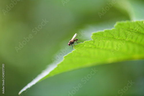 Fototapeta premium Common fly sitting on a green sheet, macro photo