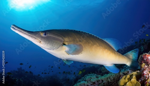 Naklejka premium Common Guitarfish Rhynchobatus djiddensis with Live Sharksucker Echeneis naucrates among Great Barrier Reef Corals, Vivid Marine Life Spectacle, Dynamic Diversity in an Underwater Kaleidoscope.
