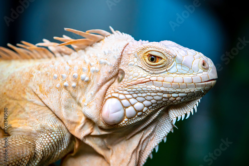 © huythoai, Obraz premium Common iguana reptile is resting on a tree in its habitat. The male iguana has a pronounced throat sac and crest. Large lizard