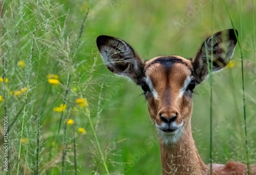 © Adrian, Fototapeta premium Common impala lamb (Aepyceros melampus) peers through the grass on Thswene Drive.