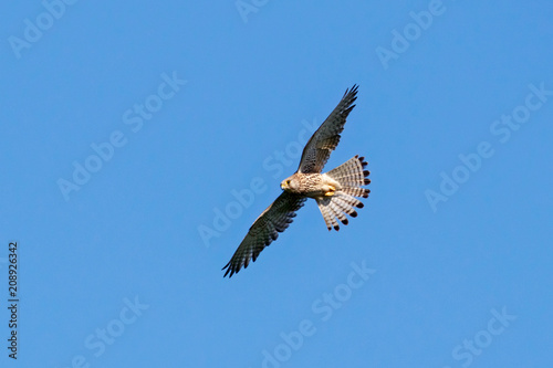 Obraz premium Common kestrel female in flight under blue sky. Cute orange falcon hovering and looking for prey. Bird in wildlife.
