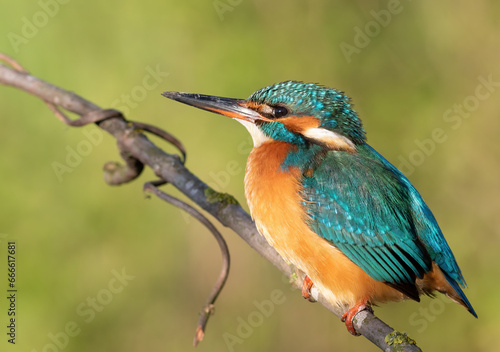 © Юрій Балагула, Fototapeta premium Common kingfisher, Alcedo atthis. A bird sitting on a branch on a beautiful green background