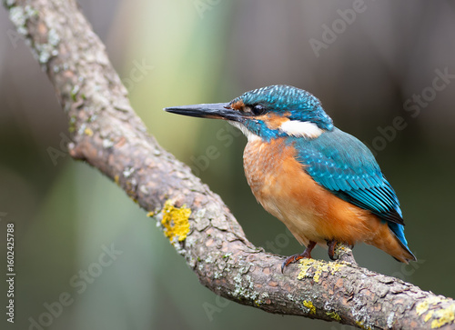 © Юрій Балагула, Fototapeta premium Common kingfisher, Alcedo atthis. A young female bird sits on a beautiful branch, flat background