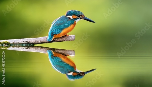 © Mason, Obraz premium common kingfisher perched on a branch with reflection showing in pond below and a green background