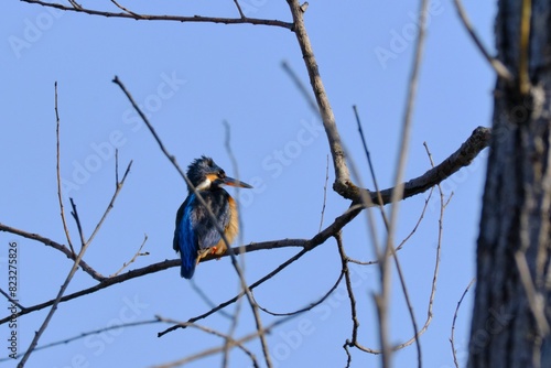 Naklejka premium Common kingfisher standing on a tree branch against a vibrant blue sky...