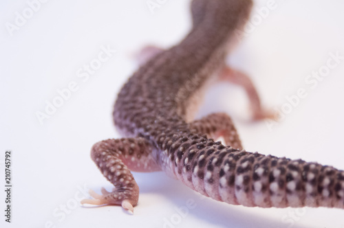 © Heather Shimmin, Naklejka premium Common leopard gecko (Eublepharis macularius) walking away from camera focus on bumpy scales of the tail on white background. Body and tail of leopard gecko on white.