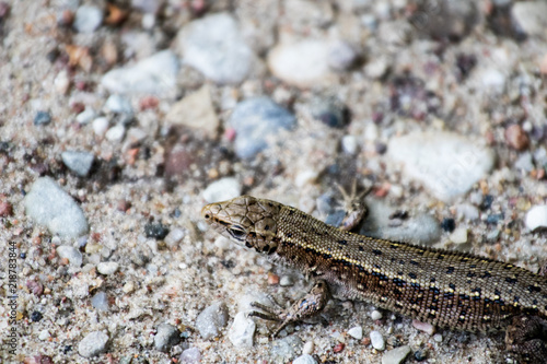 Fototapeta premium common lizard on a sandy ground. a lizard in the foreground