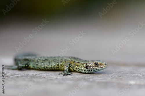 © shaftinaction, Fototapeta premium Common Lizard (zootoca vivipara) basking or sunbathing on wooden boardwalk