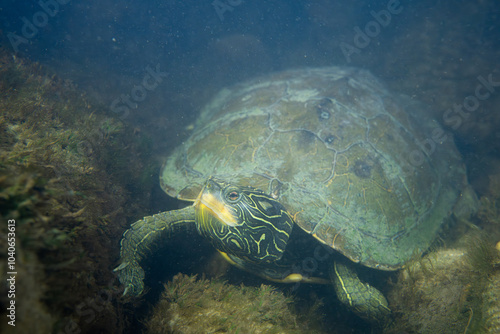 © Griffin, Fototapeta premium Common map turtle on rocky river bottom