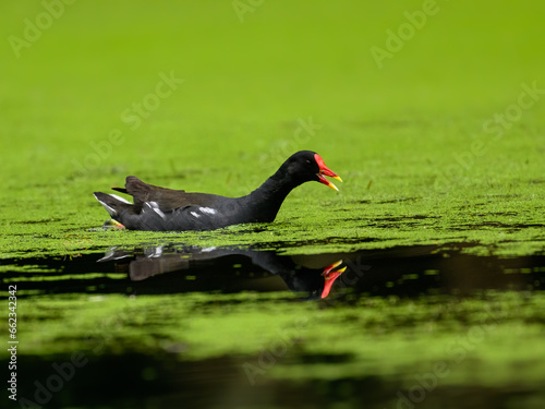 © FotoRequest, Fototapeta premium Common Moorhen or Eurasian Moorhen swimming on algae bloom pond