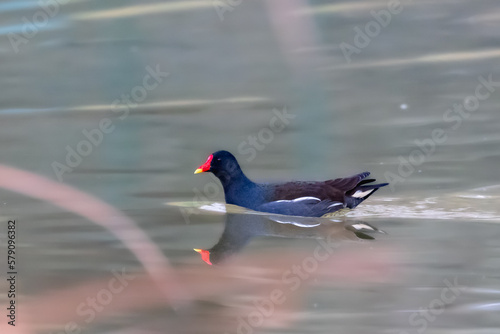 Obraz premium Common Moorhen swimming on the surface of a pond