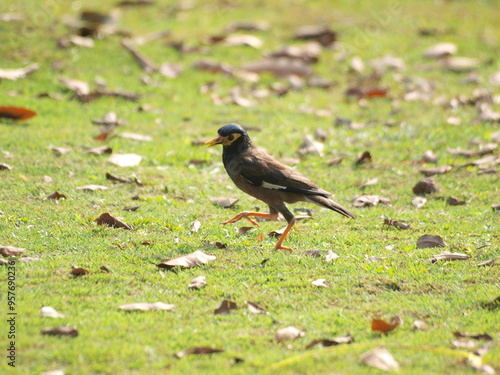 © MieVip, Obraz premium Common Myna (Acridotheres tristis). This species is a common sight in urban areas of Malaysia and is known for its adaptability and its ability to thrive in human environments.