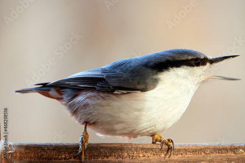 © Anna, Obraz premium Common nuthatch. Nuthatch sits on the edge of the feeder. Botanical Garden, Moscow, Russia.