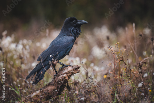 Obraz premium Common raven (Corvus corax) sitting on dry branch. Common raven portrait.