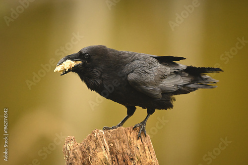 © Nick Dale, Obraz premium Common raven eats crumbs on tree stump