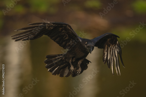 Fototapeta premium Common raven flies over pool towards camera