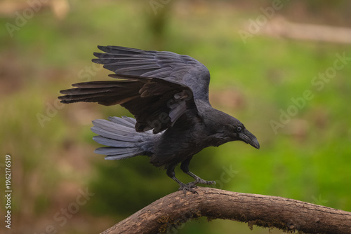 © Nick Dale, Fototapeta premium Common raven flutters wings on mossy log