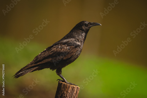 © Nick Dale, Fototapeta premium Common raven in profile on wooden post