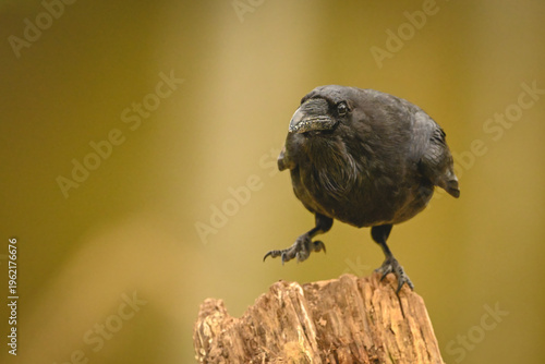 © Nick Dale, Fototapeta premium Common raven on one foot on stump
