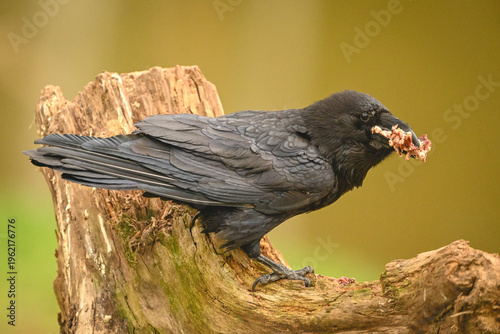 © Nick Dale, Fototapeta premium Common raven on tree stump holding food