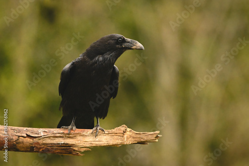 © Nick Dale, Fototapeta premium Common raven turns head on broken branch