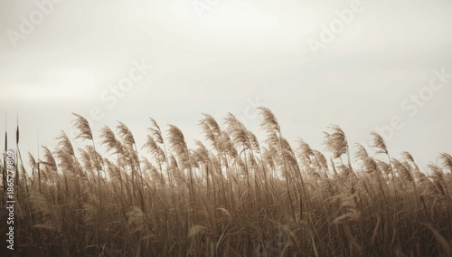 Fototapeta premium Common reed (Phragmites australis) standing tall in a wetlands landscape, highlighting ecological resilience