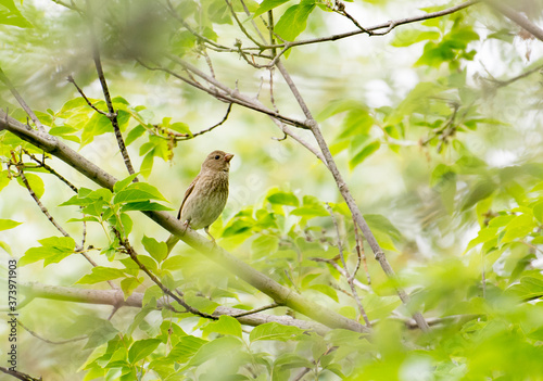 Fototapeta premium Common Rosefinch in a summer forest