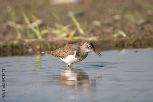 © Ganga Raj Sunuwwar, Fototapeta premium Common Sandpiper foraging in the river. The common sandpiper (Actitis hypoleucos ) is a small Palearctic wader.