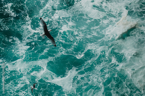 © _mishamartin, Fototapeta premium Common seagulls soaring over turquoise ocean waves at Látrabjarg, West Iceland...