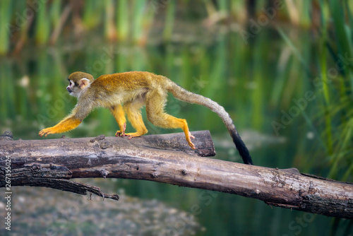 Obraz premium Common squirrel monkey walking on a tree branch above water