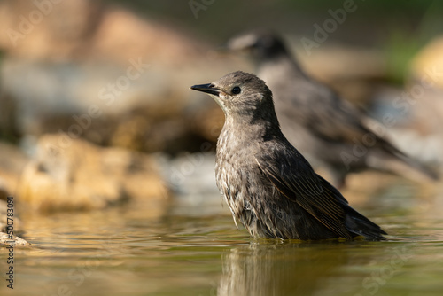 Naklejka premium Common starling bathing in a puddle