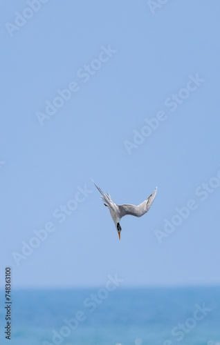 Fototapeta premium Common Tern diving for prey in natural native habitat, Bentota Beach, Sri Lanka