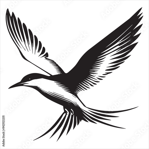 © Shineoxstock, Obraz premium Common Tern Silhouette, Sterna hirundo Bird Clipart - Common Tern soaring Illustration in black and white